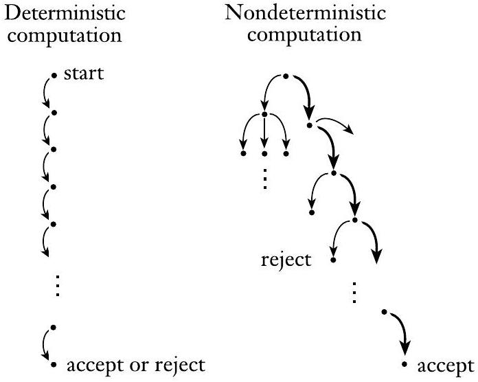 非确定性是一个有用的概念,它对计算理论产生了巨大影响。到目前为止,在我们的讨论中,计算的每一步都以一种独特的方式从前一步推导出来。当机器处于给定状态并读取下一个输入符号时,我们知道下一个状态将是什么——它是确定的。我们称之为确定性计算。在非确定性机器中,在任何时候都可能存在多种选择以进入下一个状态。