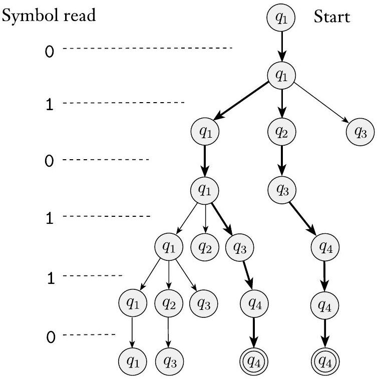 在输入010110上,从起始状态$q_{1}$开始并读取第一个符号0。从$q_{1}$开始,对0只有一个去处——即回到$q_{1}$——所以停留在那里。接下来,读取第二个符号1。在$q_{1}$上读取1时,有两种选择:要么停留在$q_{1}$,要么移动到$q_{2}$。非确定性地,机器分裂成两个副本以遵循每个选择。通过在机器可能处于的每个状态上放置一个手指来跟踪这些可能性。所以你现在在状态$q_{1}$$q_{2}$上都有手指。一个$\varepsilon$箭头从状态$q_{2}$射出,所以机器再次分裂;一个手指留在$q_{2}$上,另一个移动到$q_{3}$。你现在在$q_{1}$$q_{2}$$q_{3}$上都有手指。