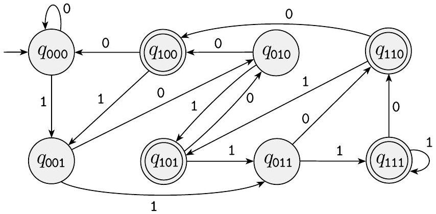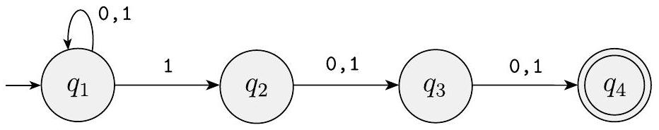 看待这个NFA计算的一种好方法是说它停留在起始状态$q_{1}$,直到它“猜测”距离末尾还有三个位置。此时,如果输入符号是1,它分支到状态$q_{2}$并使用$q_{3}$$q_{4}$来“检查”它的猜测是否正确。