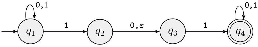 $N_{1}$在输入010上会做什么?从$q_{1}$开始放置一个手指。读取0后,你仍然只有一个手指在$q_{1}$上;但读取1后,手指会出现在$q_{1}$$q_{2}$$q_{3}$上(不要忘记$\varepsilon$箭头)。读取第三个符号0后,移除$q_{3}$上的手指,将$q_{2}$上的手指移动到$q_{3}$,并将$q_{1}$上的手指保持在原位。此时你已到达输入的末尾;由于没有手指处于接受状态,$N_{1}$拒绝此输入。