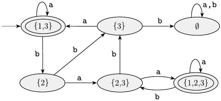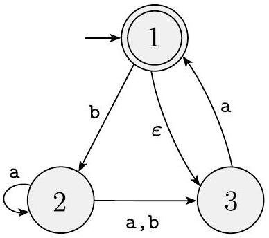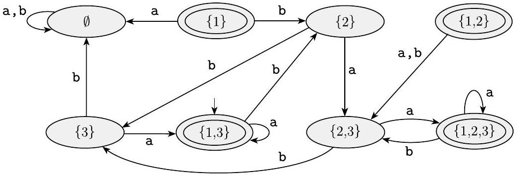 让我们用出现在例1.35中的机器$N_{4}$来说明定理1.39证明中给出的将NFA转换为DFA的过程。为了清晰起见,我们将$N_{4}$的状态重新标记为$\{1,2,3\}$。因此,在$N_{4}=(Q,\{\mathrm{a}, \mathrm{b}\}, \delta, 1,\{1\})$的形式描述中,状态集$Q$$\{1,2,3\}$,如图1.42所示。