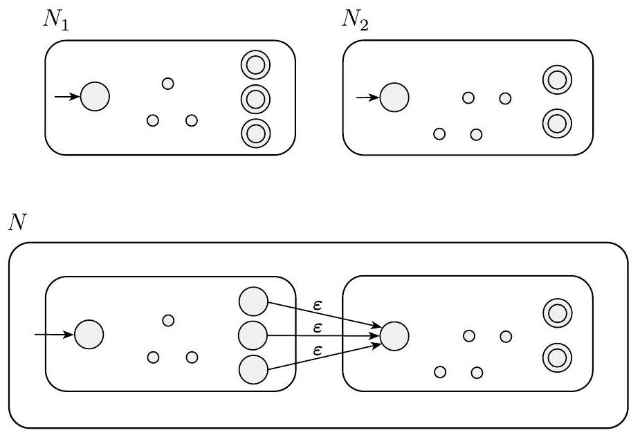 机器$N$必须在$N_{1}$$N_{2}$接受其输入时接受其输入。新机器有一个新的起始状态,它通过$\varepsilon$箭头分支到旧机器的起始状态。通过这种方式,新机器非确定性地猜测哪台机器接受输入。如果其中一台接受输入,$N$也会接受它。