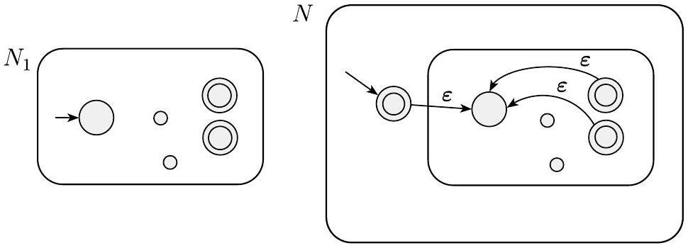 我们可以构造$N$$N_{1}$一样,但在接受状态处增加额外的$\varepsilon$箭头返回到起始状态。这样,当处理到达$N_{1}$接受的一个片段的末尾时,机器$N$可以选择跳回到起始状态,尝试读取$N_{1}$接受的另一个片段。此外,我们必须修改$N$以使其接受$\varepsilon$,而$\varepsilon$始终是$A_{1}^{*}$的成员。一个(稍微不太好)的想法是简单地将起始状态添加到接受状态集。这种方法当然会将$\varepsilon$添加到识别的语言中,但它也可能添加其他不希望的字符串。练习1.15要求举例说明这种想法的失败。解决方法是添加一个新的起始状态,该状态也是接受状态,并且具有一个指向旧起始状态的$\varepsilon$箭头。这个解决方案具有在不添加任何其他内容的情况下将$\varepsilon$添加到语言中的期望效果。
