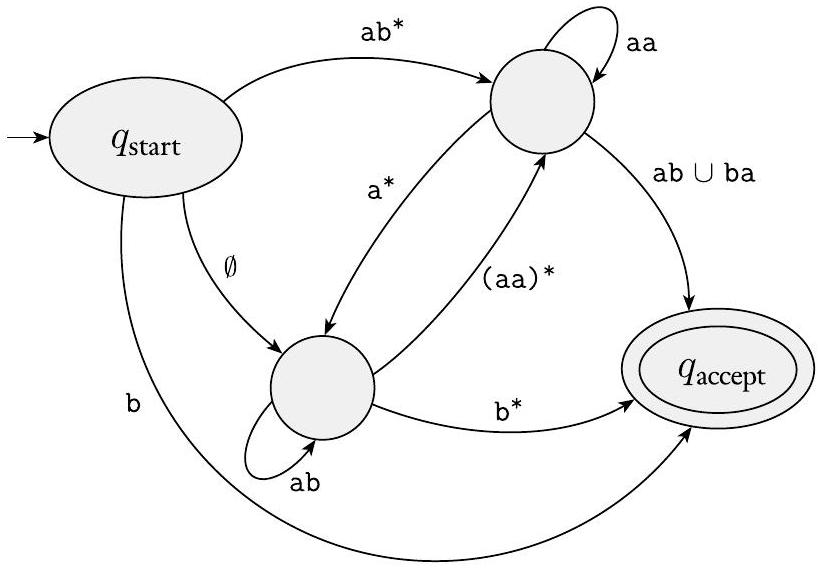 符号 $\mathcal{R}$ 是字母表 $\Sigma$ 上所有正则表达式的集合,$q_{\text {start }}$ 和 $q_{\text {accept }}$ 是起始状态和接受状态。如果 $\delta\left(q_{i}, q_{j}\right)=R$,则从状态 $q_{i}$ 到状态 $q_{j}$ 的箭头以正则表达式 $R$ 作为标签。转移函数的域是 $\left(Q-\left\{q_{\text {accept }}\right\}\right) \times\left(Q-\left\{q_{\text {start }}\right\}\right)$,因为除了没有从 $q_{\text {accept }}$ 出发或指向 $q_{\text {start }}$ 的箭头外,每个状态都连接到每个其他状态。