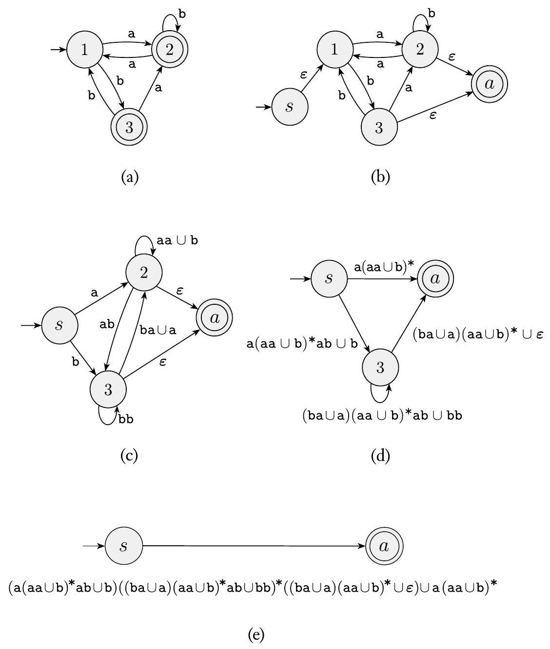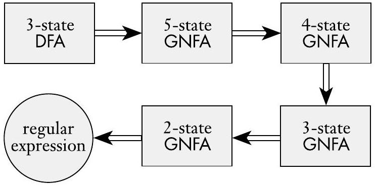 现在我们展示如何将 GNFA 转换为正则表达式。假设 GNFA 有 $k$ 个状态。那么,因为 GNFA 必须有一个起始状态和一个接受状态,并且它们必须彼此不同,我们知道 $k \geq 2$。如果 $k>2$,我们构造一个具有 $k-1$ 个状态的等价 GNFA。此步骤可以在新的 GNFA 上重复,直到它减少到两个状态。如果 $k=2$,GNFA 有一个从起始状态到接受状态的单一箭头。此箭头的标签就是等价的正则表达式。例如,将一个三状态 DFA 转换为等价正则表达式的阶段如下图所示。