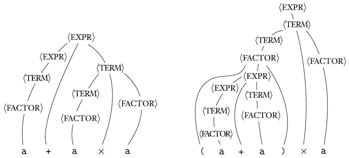 这个文法二义性地生成了字符串 $\mathrm{a}+\mathrm{a} \times \mathrm{a}$。下图显示了两个不同的分析树