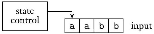 下图是有限自动机的示意图。控制表示状态和转移函数,纸带包含输入字符串,箭头表示输入磁头,指向要读取的下一个输入符号。