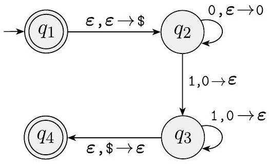 以下是识别语言 $\left\{0^{n} 1^{n} \mid n \geq 0\right\}$ 的 PDA(第 112 页)的形式描述。设 $M_{1}$ 是 ( $Q, \Sigma, \Gamma, \delta, q_{1}, F$ ),其中