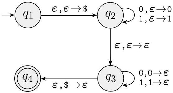 我们还可以使用状态图来描述 PDA,如图 2.15、2.17 和 2.19 所示。这些图类似于用于描述有限自动机的状态图,并进行了修改以显示 PDA 在状态之间转换时如何使用其栈。我们写“ $a, b \rightarrow c$ ”表示当机器正在从输入中读取 $a$ 时,它可以将栈顶的符号 $b$ 替换为 $c$。$a, b$ 和 $c$ 中的任何一个都可以是 $\varepsilon$。如果 $a$ 是 $\varepsilon$,机器可以在不读取任何输入符号的情况下进行此转移。如果 $b$ 是 $\varepsilon$,机器可以在不读取和弹栈任何符号的情况下进行此转移。如果 $c$ 是 $\varepsilon$,机器在沿着此转移时不会在栈上写入任何符号。
