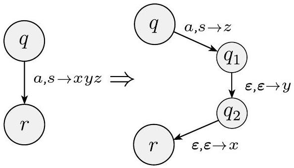 赋予 $P$ 特征 1 和 2 很容易。为了赋予它特征 3,我们用一个通过新状态的两个转移序列替换每个同时弹栈和压栈的转移,并且我们用一个压栈然后弹栈任意栈符号的两个转移序列替换每个既不弹栈也不压栈的转移。