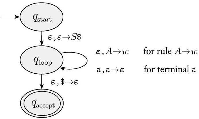 最后,我们处理情况 (c),其中空栈标记 $\$$ 在栈顶。设 $\delta\left(q_{\text {loop }}, \boldsymbol{\varepsilon}, \$\right)=\left\{\left(q_{\text {accept }}, \boldsymbol{\varepsilon}\right)\right\}$。