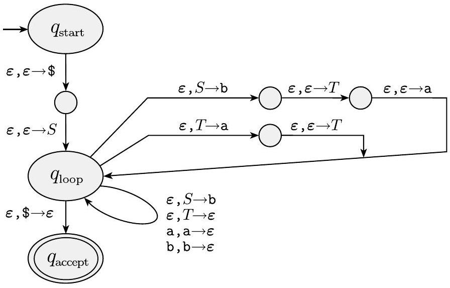 转移函数定义如下。我们首先将栈初始化为包含符号 $\$$ 和 $S$,实现非正式描述中的步骤 1:$\delta\left(q_{\text {start }}, \boldsymbol{\varepsilon}, \boldsymbol{\varepsilon}\right)=\left\{\left(q_{\text {loop }}, S \$\right)\right\}$。然后我们为步骤 2 的主循环放入转移。
