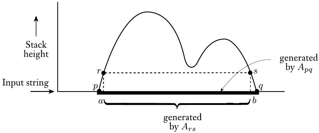 在 $P$ 对 $x$ 的计算过程中会出现两种可能性。要么最后弹栈的符号与最初压栈的符号相同,要么不同。如果是这样,栈可能只在 $P$ 对 $x$ 的计算的开始和结束时为空。如果不是,最初压栈的符号必须在 $x$ 结束之前的某个点被弹栈,因此栈在此点变空。我们用规则 $A_{p q} \rightarrow a A_{r s} b$ 模拟前一种可能性,其中 $a$ 是第一个动作读取的输入,$b$ 是最后一个动作读取的输入,$r$ 是 $p$ 之后的状态,$s$ 是 $q$ 之前的状态。我们用规则 $A_{p q} \rightarrow A_{p r} A_{r q}$ 模拟后一种可能性,其中 $r$ 是栈变空时的状态。