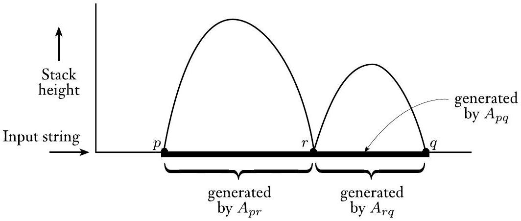 如果 $A_{p q}$ 生成 $x$,那么 $x$ 可以将 $P$ 从 $p$(空栈)带到 $q$(空栈)。