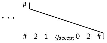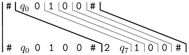 现在我们举一个假设的例子来说明我们目前所构建的内容。令 $\Gamma=\{0,1,2, \sqcup\}$。假设 $w$ 是字符串 $0100$,并且 $M$ 的起始状态是 $q_{0}$。在状态 $q_{0}$ 中,读取一个 $0$ 后,假设转移函数规定 $M$ 进入状态 $q_{7}$,在纸带上写入一个 $2$,并将磁头向右移动。换句话说,$\delta\left(q_{0}, 0\right)=\left(q_{7}, 2, \mathrm{R}\right)$。