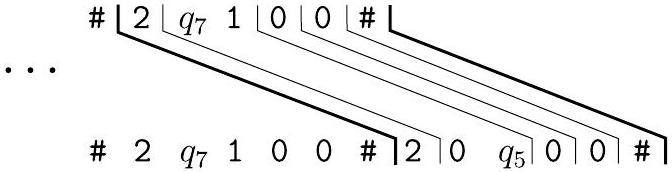 继续举例,假设在状态 $q_{7}$ 中,读取一个 $1$ 后,$M$ 进入状态 $q_{5}$,写入一个 $0$,并将磁头向右移动。也就是说,$\delta\left(q_{7}, 1\right)= \left(q_{5}, 0, \mathrm{R}\right)$。那么我们有多米诺骨牌