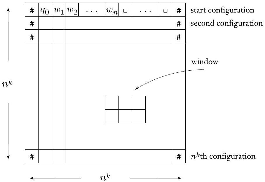 接下来,我们取 NP 中的任何语言 $A$,并证明 $A$ 可多项式时间归约到 SAT。令 $N$ 是一个在 $n^{k}$ 时间内决定 $A$ 的非确定性图灵机,其中 $k$ 为某个常数。(为方便起见,我们实际上假设 $N$ 在 $n^{k}-3$ 时间内运行;但只有对细节感兴趣的读者才需要担心这个小问题。)以下概念有助于描述归约。