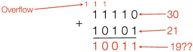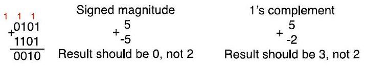 $$ \begin{array}{cc} 1 \quad 1 \quad 1 & \text { Signed magnitude } \\ +0101 & +5 \\ +1101 & +-5 \\ \hline 0010 & \text { Result should be } 0, \text { not } 2 \end{array} $$